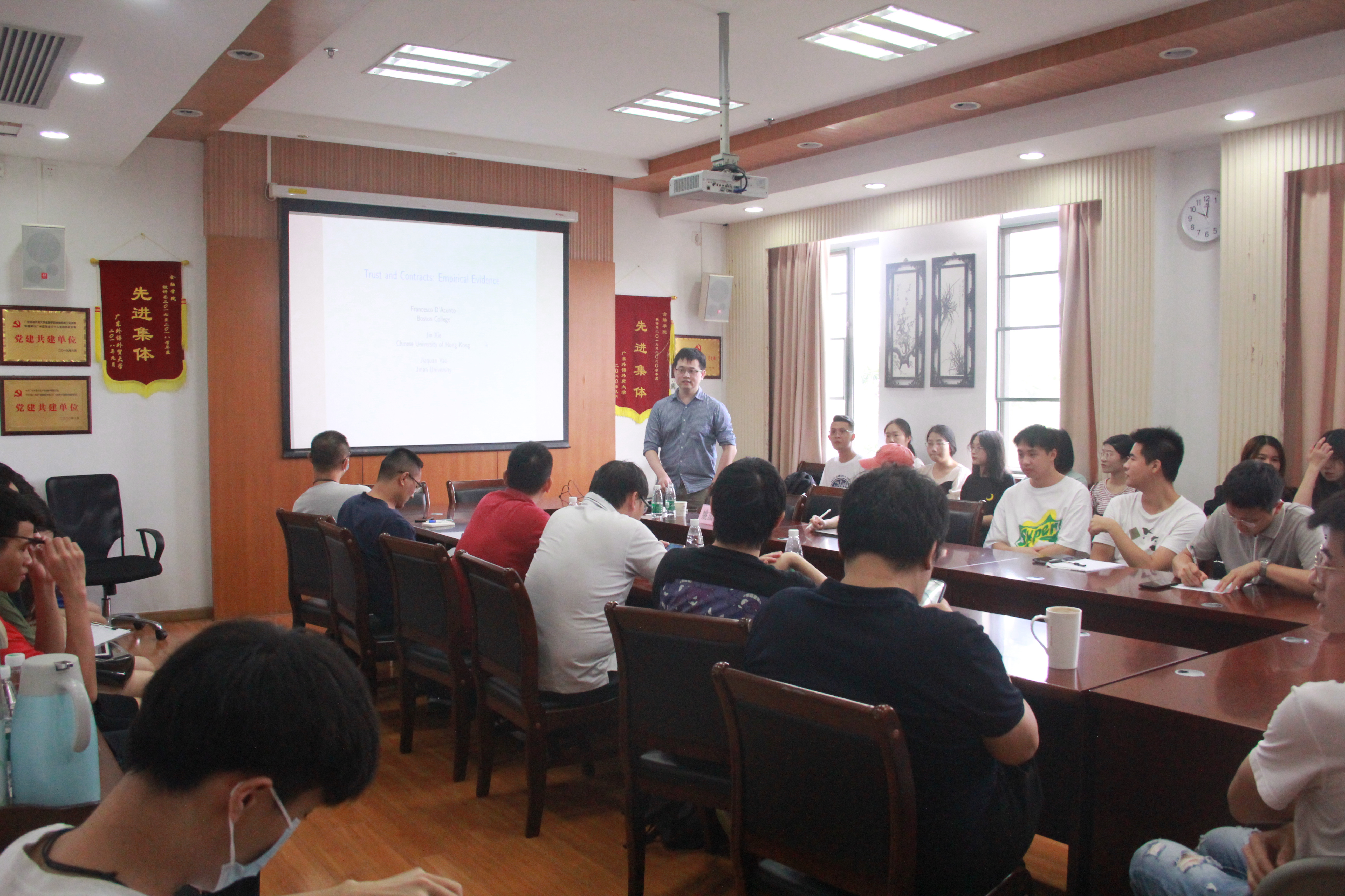 9月27日,暨南大学姚加权教授应邀做客广外金融论坛77讲,为师生带来题为“Trust and Contracts: Empirical Evidence”的学术讲座。讲座由青年珠江学者姚海祥教授主持,金融学院副院长张浩副教授、院长助理邓超副教授、金融系系主任许振国博士、刘浩博士、陈宗豪博士、梁裕珩博士等多名教师及各年级学生参加,现场座无虚席。