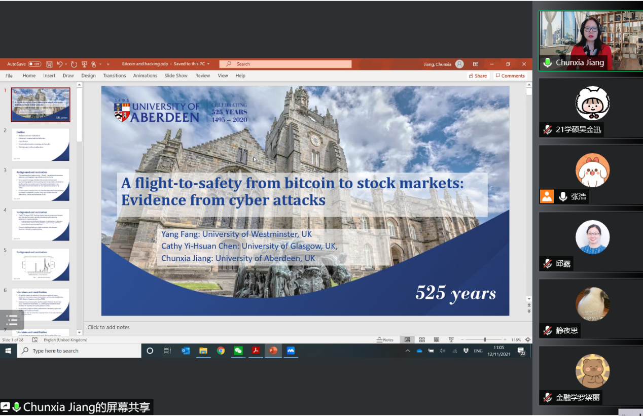 11月12日,英国阿伯丁大学商学院姜春霞副教授应邀做客广外金融论坛80讲,通过腾讯会议的线上形式,为师生带来题为“A flight-to-safety from bitcoin to stock markets: Evidence from cyber attacks”的学术讲座。讲座由金融学院副院长张浩主持,我院多名教师及学生参加。