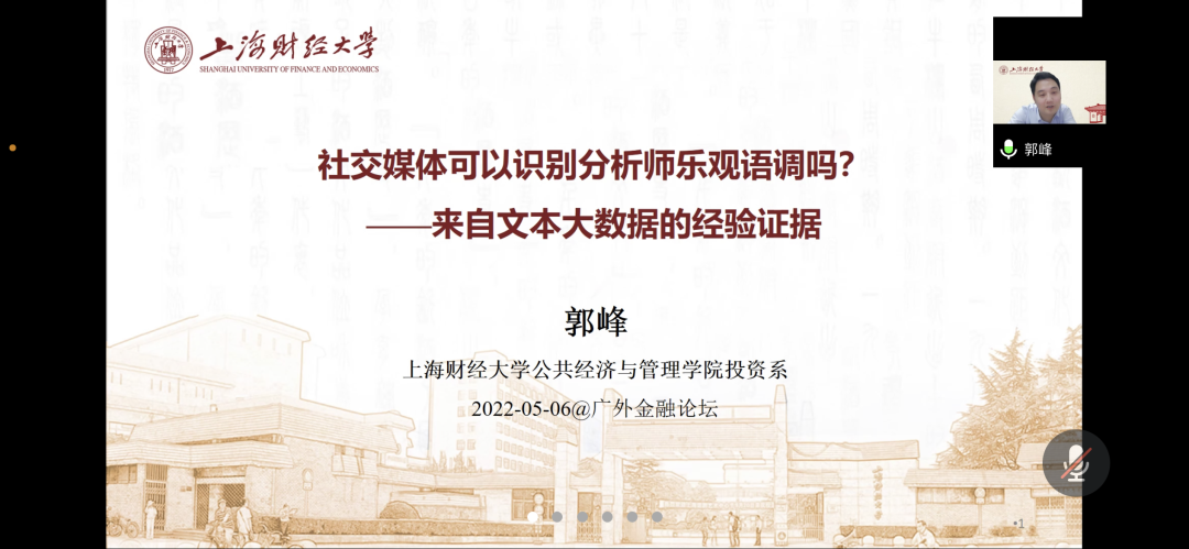 5月6日,上海财经大学公共经济与管理学院副教授郭峰应邀做客广外金融论坛第87讲,通过腾讯会议,郭峰以“社交媒体可以识别分析师乐观语调吗?——来自文本大数据的经验证据”为题进行学术报告。此次讲座由金融学院副院长张浩主持,学院师生积极参与。