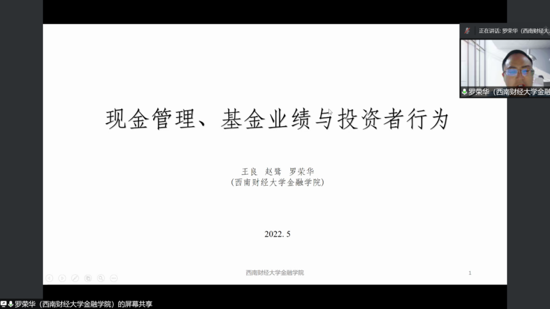 5月10日,西南财经大学金融学院副院长、博士生导师罗荣华教授应邀做客广外金融论坛第88讲。通过线上会议的形式,罗荣华以“现金管理、基金业绩与投资者行为”为题进行学术分享。此次讲座由金融学院副院长张浩主持,学院师生积极参与。