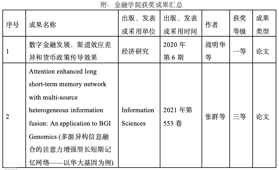 近日,广东省人民政府公布了第十届广东省哲学社会科学优秀成果奖的获奖名单。我院战明华教授的论文《数字金融发展、渠道效应差异和货币政策传导效果》摘得论文类一等奖。同时,张群副教授的论文“Attention enhanced long short-term memory network with multi-source heterogeneous information fusion: An application to BGI Genomics(《多源异构信息融合的注意力增强型长短期记忆网络——以华大基因为例》)”获得论文类三等奖。这是我院在省哲学社会科学领域取得的重要突破,标志着我院在该领域研究水平的显著提升。